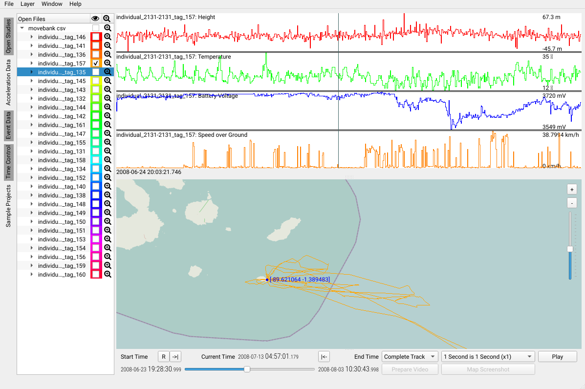 A double click selection of a track point on the map will show a vertical bar in the event window that marks the respective timestamp as well.