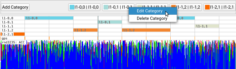 The initial result is an assignment of an abstract category to each burst. This can be visualized by annotation layers above the raw acceleration data (one layer per category). Abstract categories can then be analyzed in a GPS and sensor data context and assigned to known behavioral categories. By overlaying observation data or gold standards the validity of the predicted categories can be analyzed.